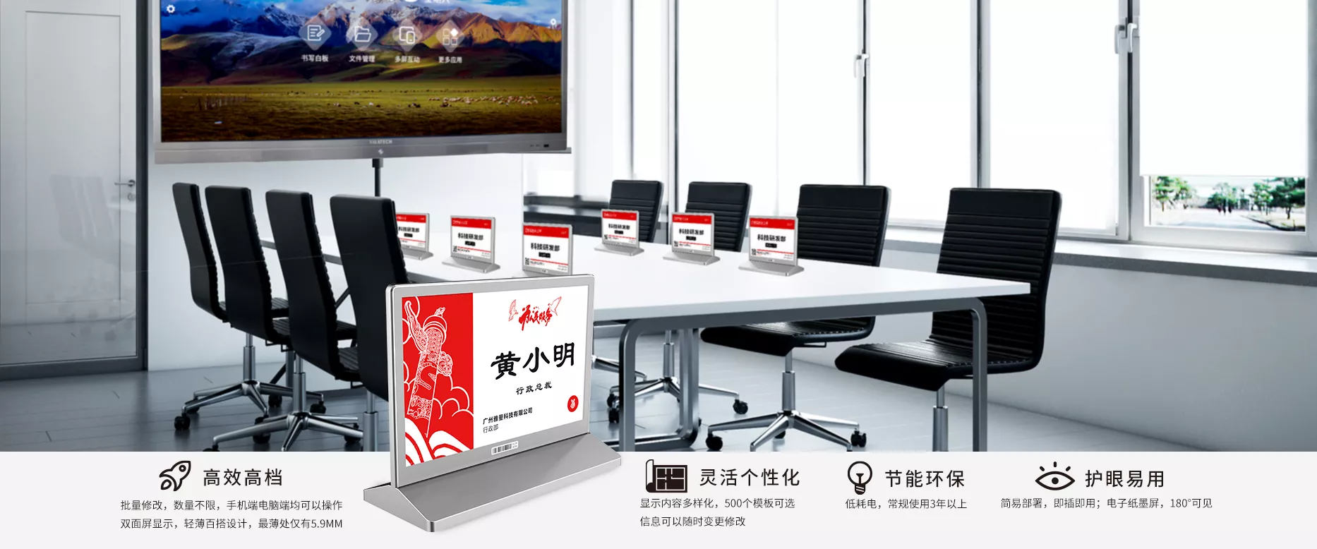雅量双面智能电子桌牌厂家以高科技为核心,多年专注研发生产高性能、操作简便、使用方便的双面智能电子桌牌,产品远销海内外,深受众多企业单位的喜爱。
